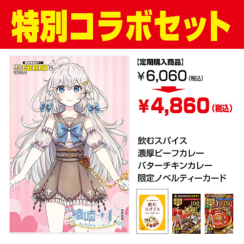 ビーフカレーとバターチキンカレー&飲むスパイス+限定ノベルティのついたコラボセットです。